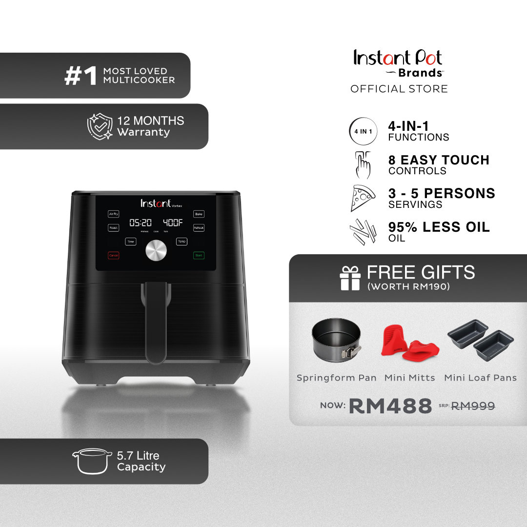 Instant™ Vortex™ Air Fryer menawarkan alternatif yang lebih sihat dan mudah untuk menggoreng dalam, ditambah dengan kepelbagaian panggang, bakar dan panaskan semula. Vortex membolehkan anda mencipta versi yang lebih sihat bagi semua makanan bergoreng kegemaran anda - daripada segar kepada beku - garing hingga sempurna dan lazat tanpa rasa bersalah. Dapatkan rasa dan tekstur yang digoreng dengan kurang minyak sehingga 95% dan nikmati pembersihan yang mudah. gris minimum bermakna kucar-kacir yang minimum dan kos yang minimum!